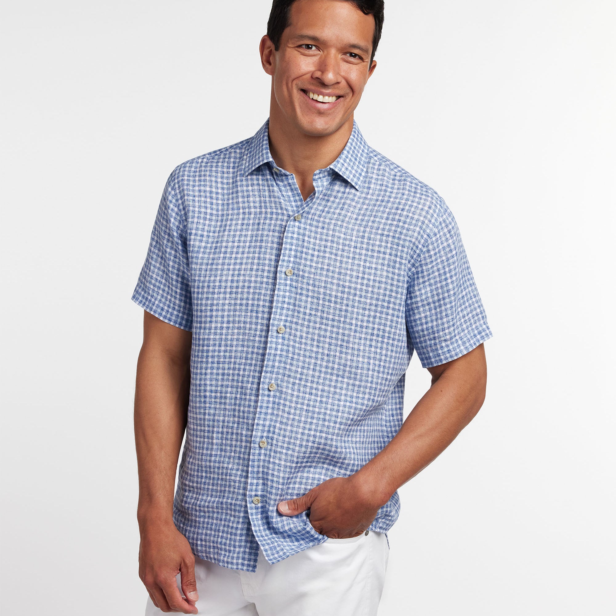 Navy & Sky Linen Check Short Sleeve Shirt