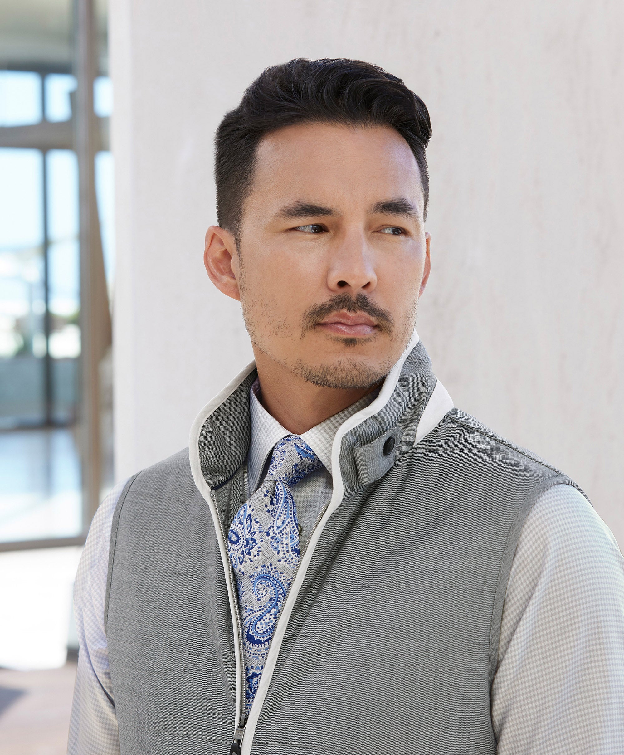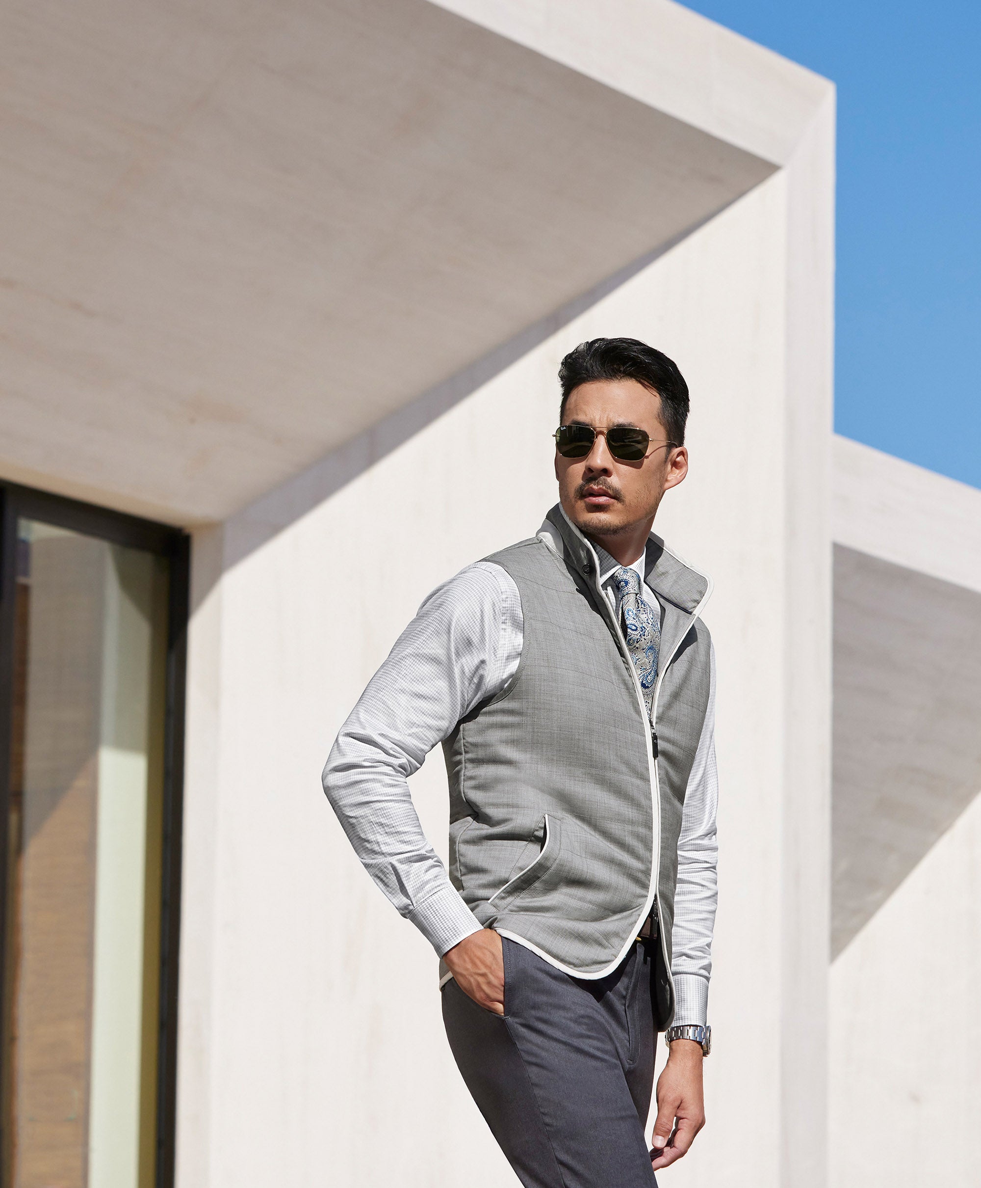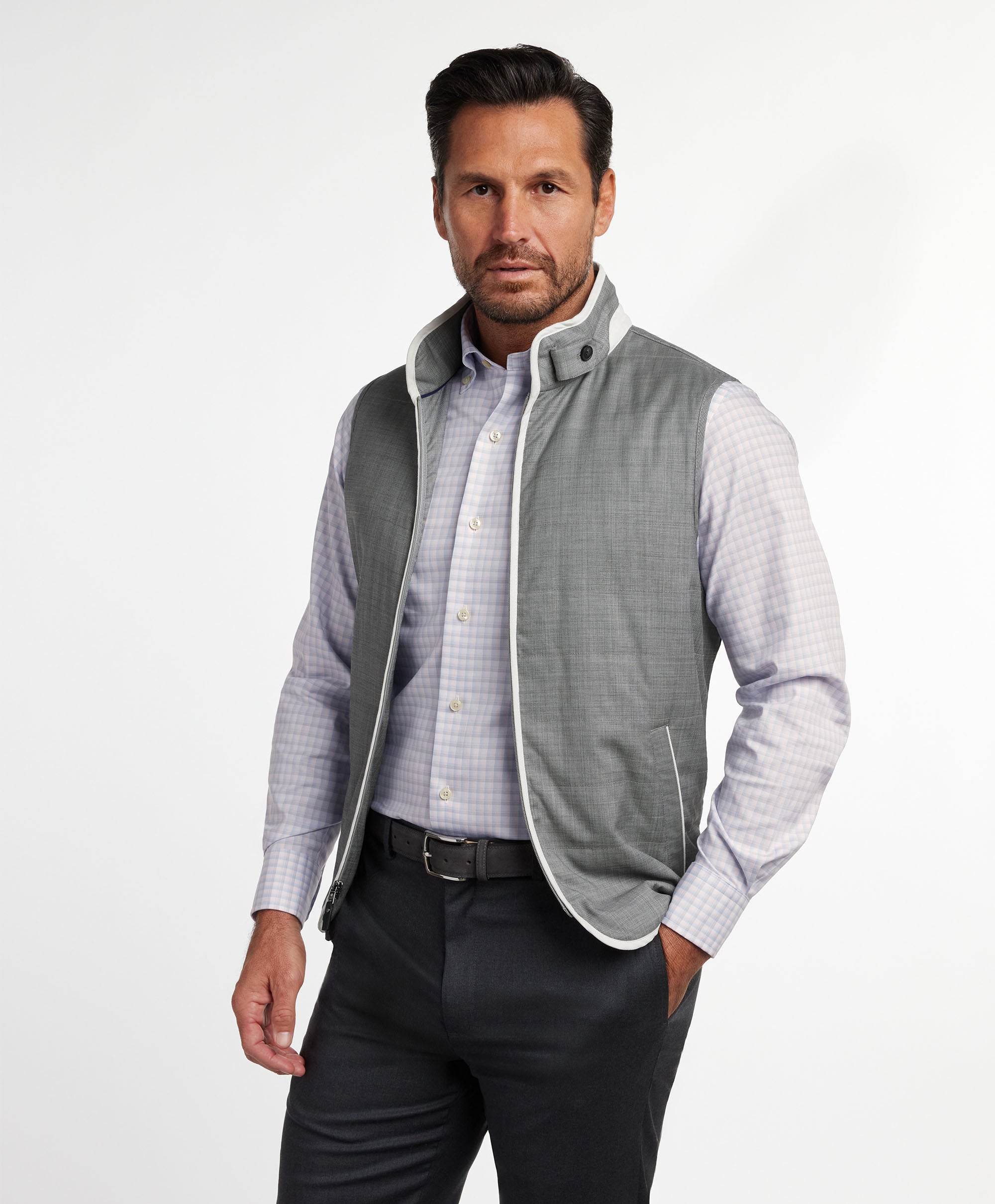 A study in quiet luxury. The Urban Vest is crafted from Super 130s wool with a supple hand, faux suede details, and clean, tailored lines. Streamlined finishing and practical pockets give it a refined presence. Perfect for the office, wear it with a dress shirt and tailored trousers or your favorite five-pockets.